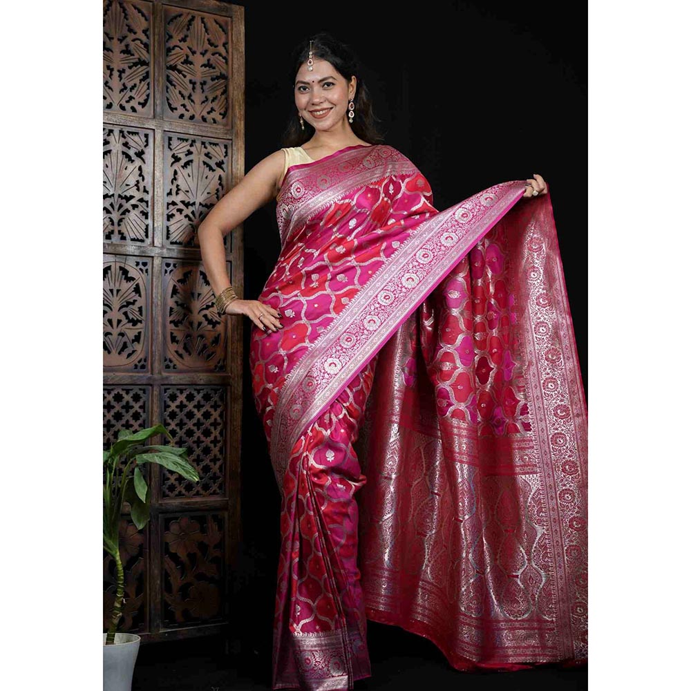 Description : Mashru Silk With Intricate Zari Weaving And Floral Jaal Design Ready To Wear Saree