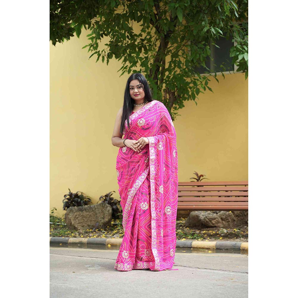 Description : Georgette Bandhej With Gota Patti And Zari Lace Work Border Ready To Wear Saree