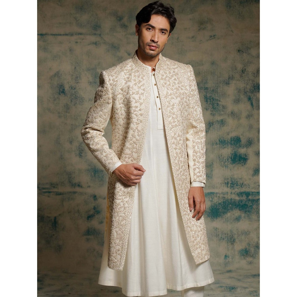 Jatin Malik Ivory Embroidered Pearl Open Sherwani with Kurta and Churidar and Dupatta