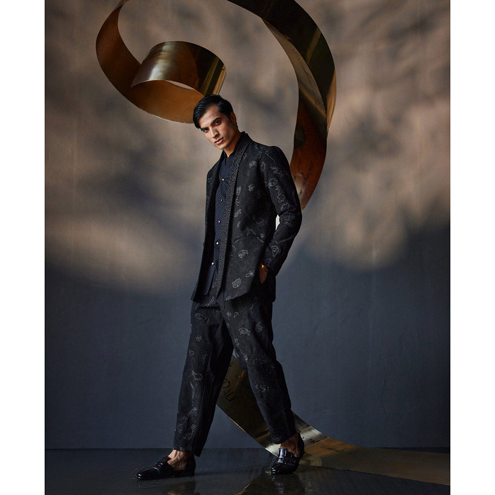 Description : This sleek black blazer set features intricate motifs inspired by Dali's artworks. This blazer is a tribute to the enchanting world of Dali, a symphony of his surreal creations woven into every thread. Paired with a matching embroidered jogger and pintuck detailed shirt with gold button detailing.