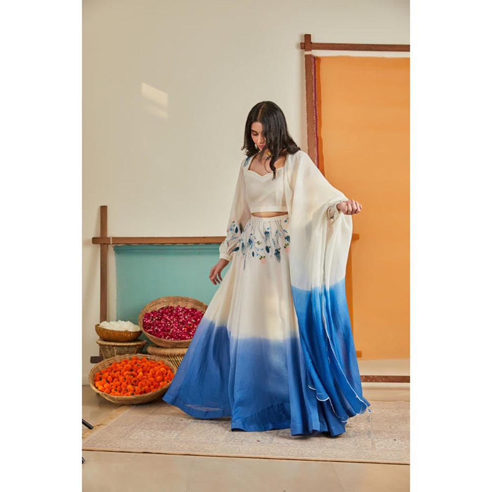 Our Indigo-White Ombre Lehenga Set Is Crafted In Elegant Chanderi . Lavender-Like Blooms Cascade Upside Down From The Waist, While The White Chanderi Blouse Features A Sweetheart Neckline And Balloon Sleeves Adorned With Hand-Embroidered Flowers. The Ensemble Is Completed With An Ombre-Dyed Dupatta Boasting A Scalloped Border. Lehenga Comes With A Zipper On The Side Seam And Choli Has A Zipper Opening And Keyhole Button At Back.