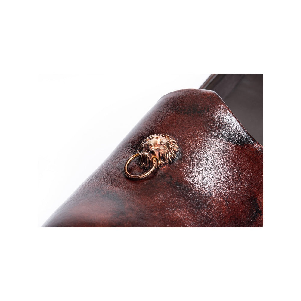 Description : Kavith Brown Patina Ornament Juttis are handpainted using Patina Art to get the vintage look. Finished with the iconic lion's head ornament on the toe for a truly ceremonial look, this pair is made using pure leather. Flaunt it at the next event to create a stunning style statement.