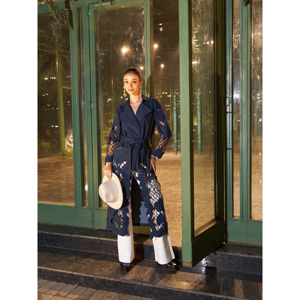 Description : A Unique Denim Trench with Intricate Crochet Detailing, Blending Classic and Bohemian Styles.