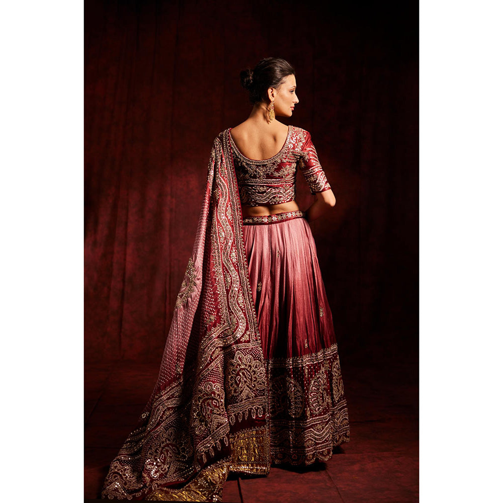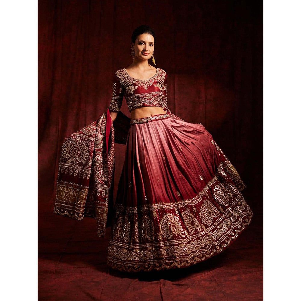 Label Gayatri Bishnoi Maroon Pure Gajji Silk Bandhej Lehenga with Blouse and Dupatta (Set of 3)