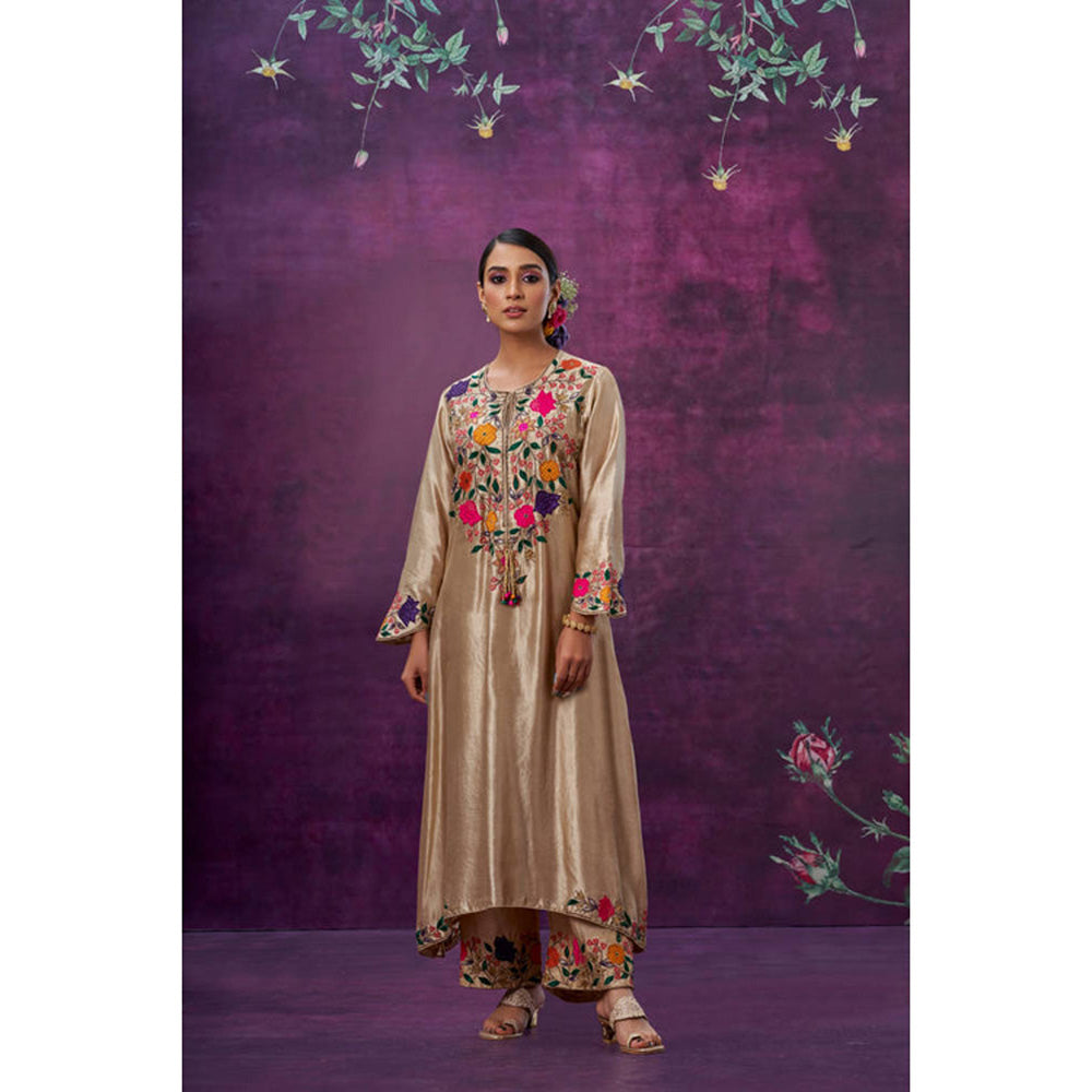 Description : Label Niti Bothra Beige Floral Embroidered Yoke Kurta With Palazzo