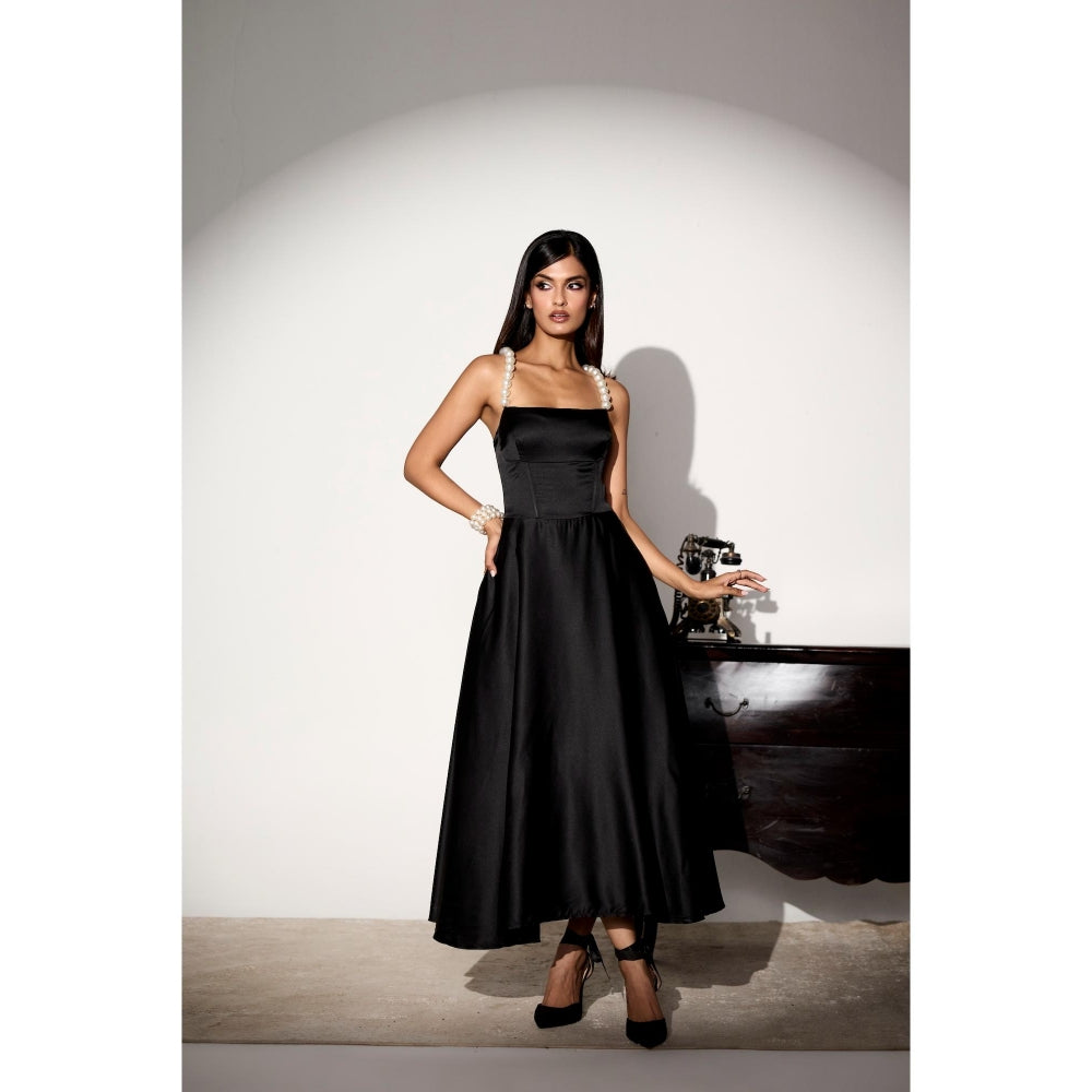 Description : Timeless and decadent, the vivienne pearl strap dress is an ode to classic femininity with a modern, sculpted edge. Crafted in lustrous jet-black satin, the dress drapes with a liquid sheen that catches light with every movement. Its corseted bodice shapes the silhouette with clean structure, while the flared midi skirt flows with effortless grace. Bodice - cut to contour, the structured corset bodice features subtle boning and a square neckline that beautifully frames the decolletage. The standout detail - oversized pearl-beaded straps - adds a touch of vintage glamour and texture to the minimalist silhouette. Skirt - the full-length satin skirt flows in a soft a-line, balancing volume with fluidity and lending a timeless elegance to the look. Finishing details - concealed side zip ensures a seamless fit, while the pearl straps and sleek tailoring elevate the dress into a statement of quiet luxury.