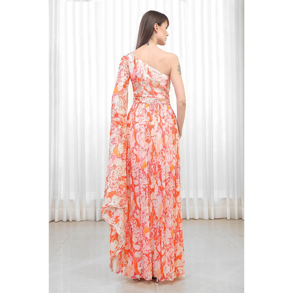 Description : Flaunt your chic look with this orange dress from Mandira Wirk. Tailored with care from georgette, it features one shoulder, printed detailing, and is accented with a normal fit. Team this dress with a pair of heels for a stylish look.