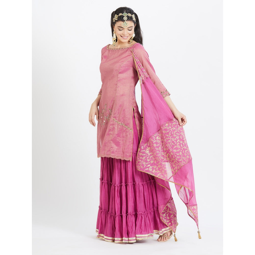 Description : Amp up the festivity in our embroidered purple tissue kurta and layered sharara set, with a hand-foil printed dupatta!