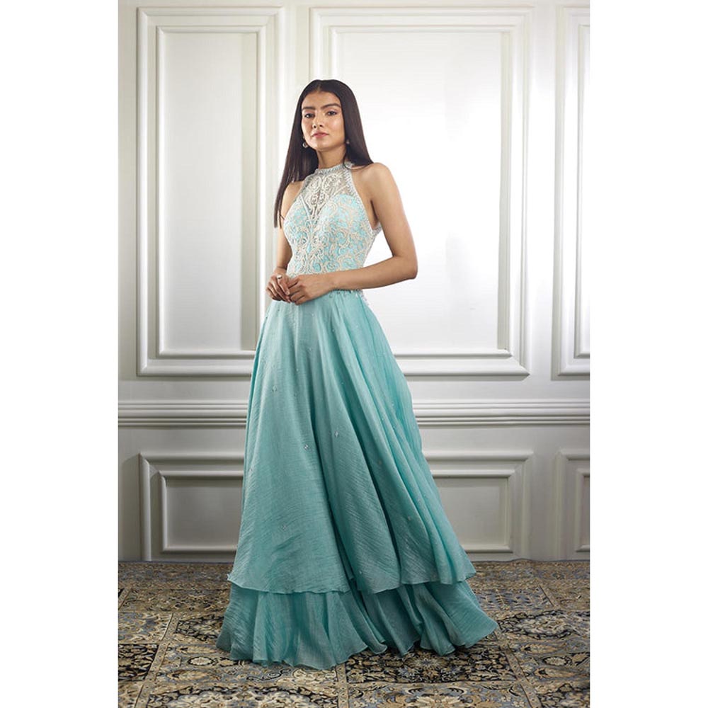 description : Reinvigorate your wardrobe with this aqua Anarkali set from MANDIRA WIRK. Crafted from chanderi, this beautiful set is finished with a sleeveless design and halter neck. Pair it with exquisite jewellery to finish off the look.