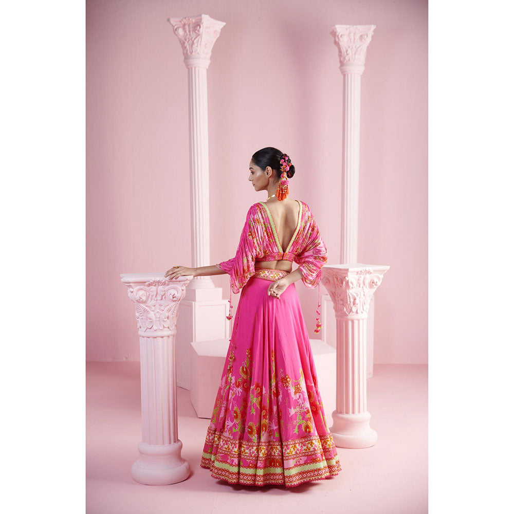 Description : Adorn the ethnic bliss with this pink Lehenga Set from MANDIRA WIRK. Made from high quality chanderi, it features hook and eye closure and floral pattern along with flared sleeves & v-neck design. Pair it with wedges or heels and some jewellery to complete your ensemble.