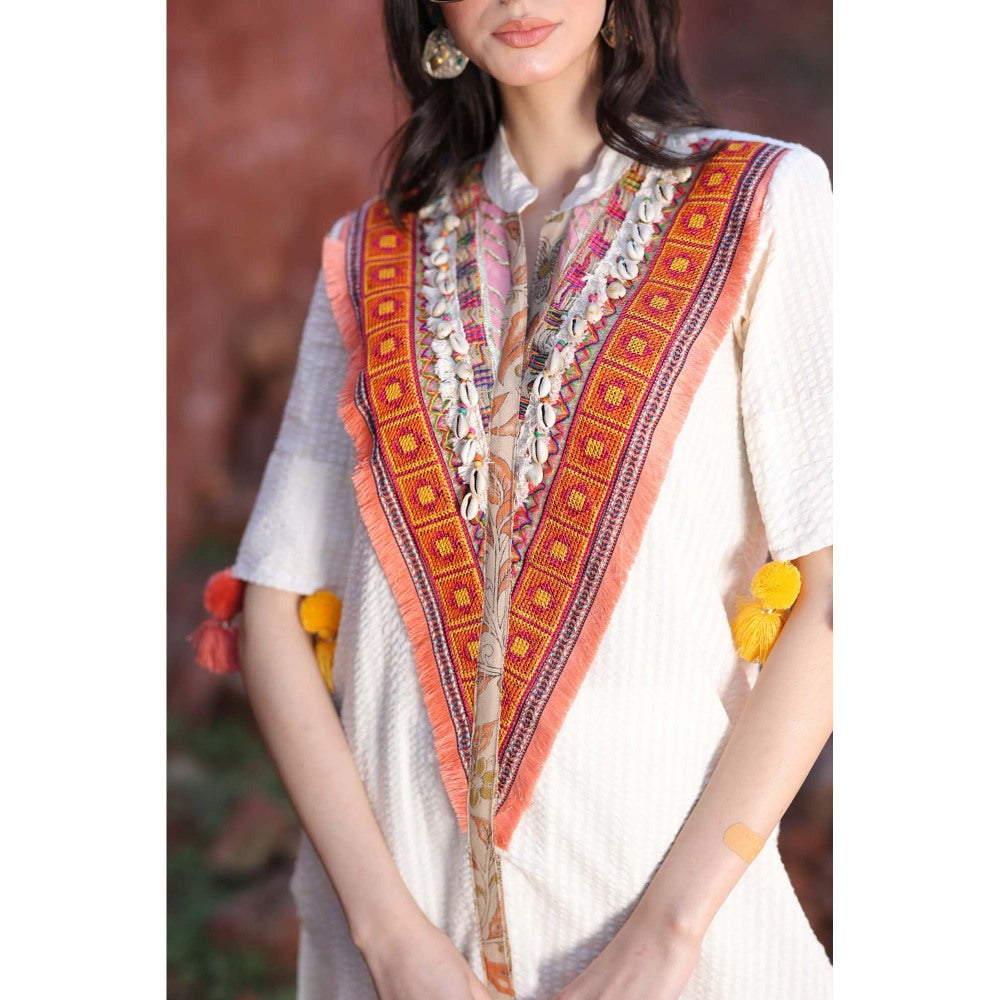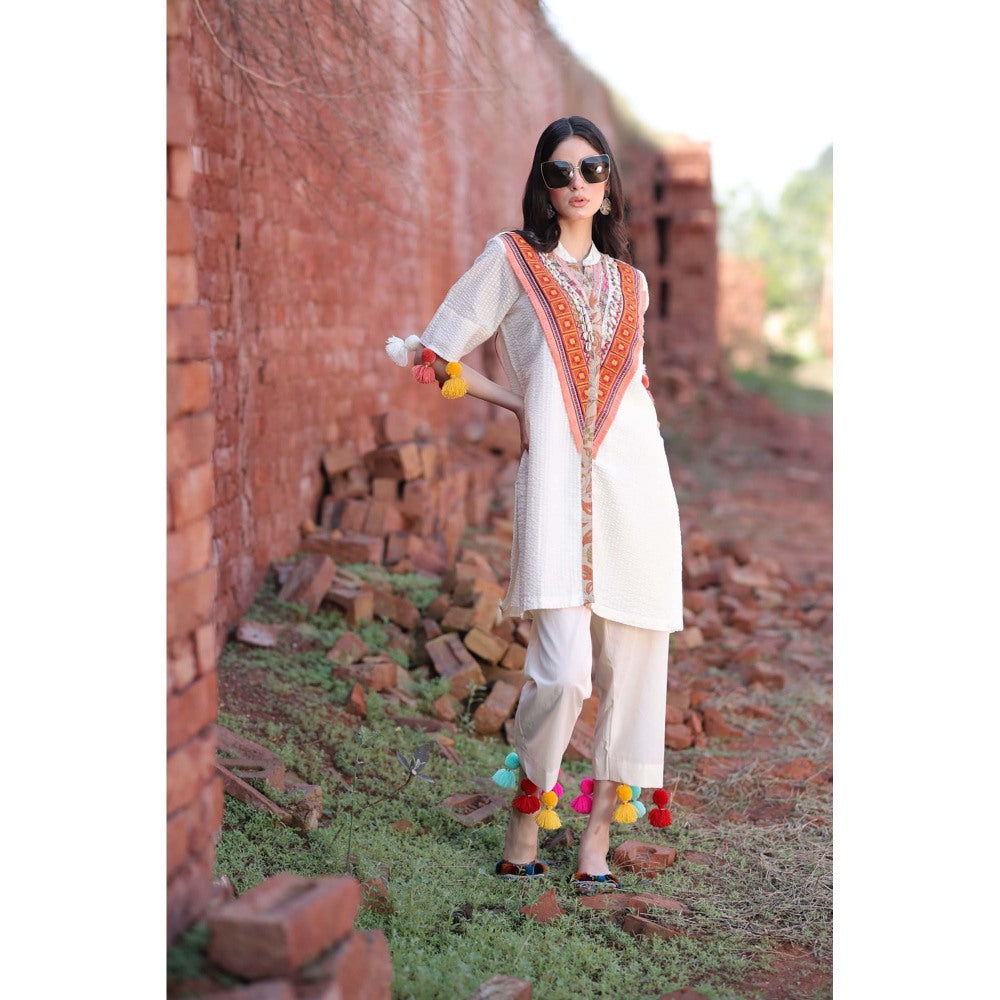 Description : Step Into Soul-Soaked Elegance with This Handcrafted Ivory Kurta Set From The Rooh Ss25 Collection By Mani Dua Khanna. Featuring A Richly Embroidered Front Yoke In Tribal-Inspired Hues and Mirror Work, This Piece Brings Together Earthy Tradition and Playful Design. Voluminous Tassels On The Sleeves and Pant Hems Add Whimsy, While The Soft Textured Cotton Ensures Breathable Comfort. Perfect for Sun-Drenched Escapes, Slow Sundays, or Spirited Get-Togethers.