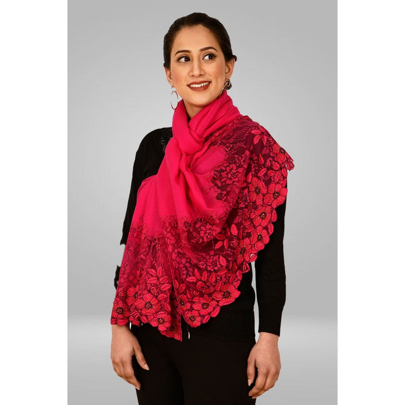 MAULI CASHMERE Floral Inset Embroidered Fine Merino Wool Stole