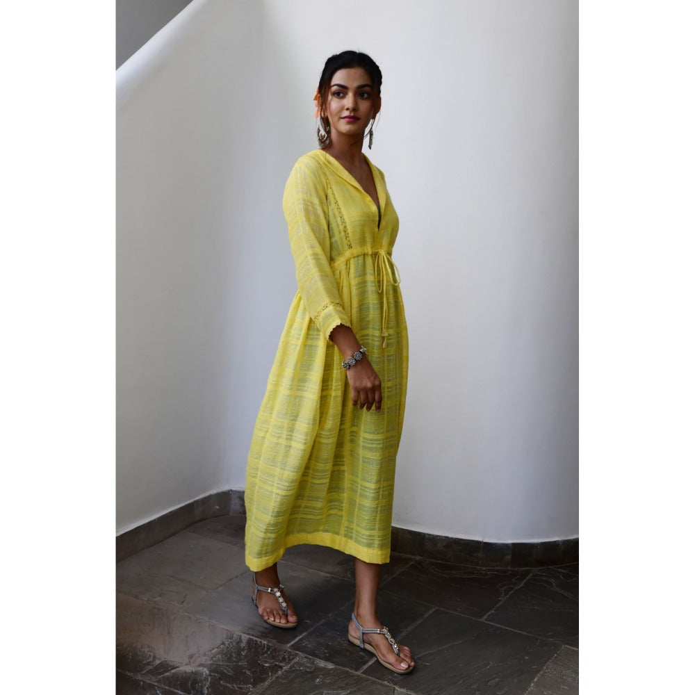 Description : Amaltas-yellow dress crafted in beautiful hand-woven cotton lurex. Featuring crochet lace inserts and draw-string detail, it is perfectly paired with contrast grey inner.
