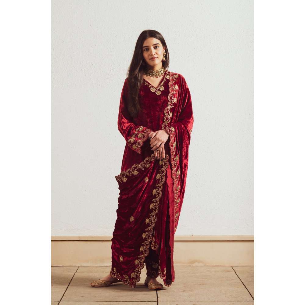 Neelu Sethi Embroidered Velvet Kurta and Pant With Dupatta (Set of 3)