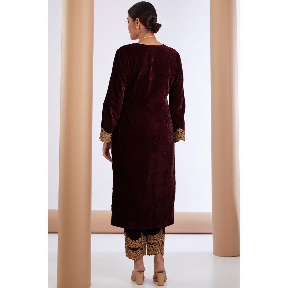 Wine Embroidered Kurta Pant & Dupatta (Set of 3)