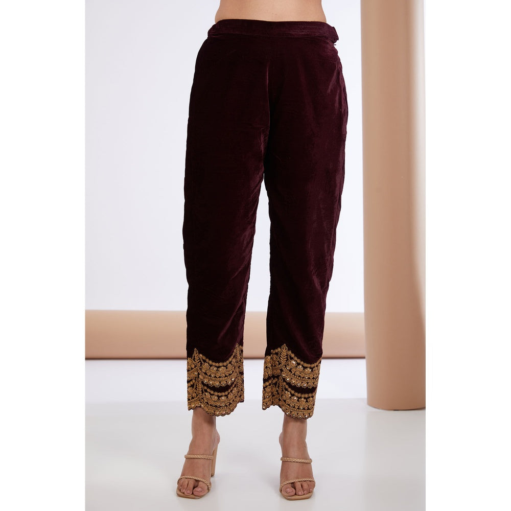 Description : Wine Embroidered Kurta-Pant and Dupatta. Tailored to sartorial perfection from premium quality fabric, it assures a soft and soothing touch against the skin. The exquisite silhouette adds to its appeal.
