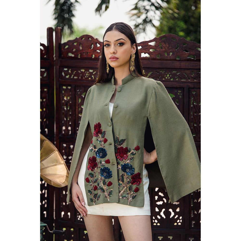 NEIZA Olive Green Pink with Red and Navy Embroidery Cape