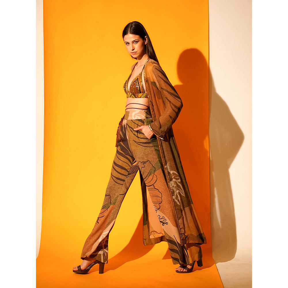 Nikita Mhaisalkar Tropical Brown Jacket Pants Co-ord with Hand Embroidered Border (Set of 2)