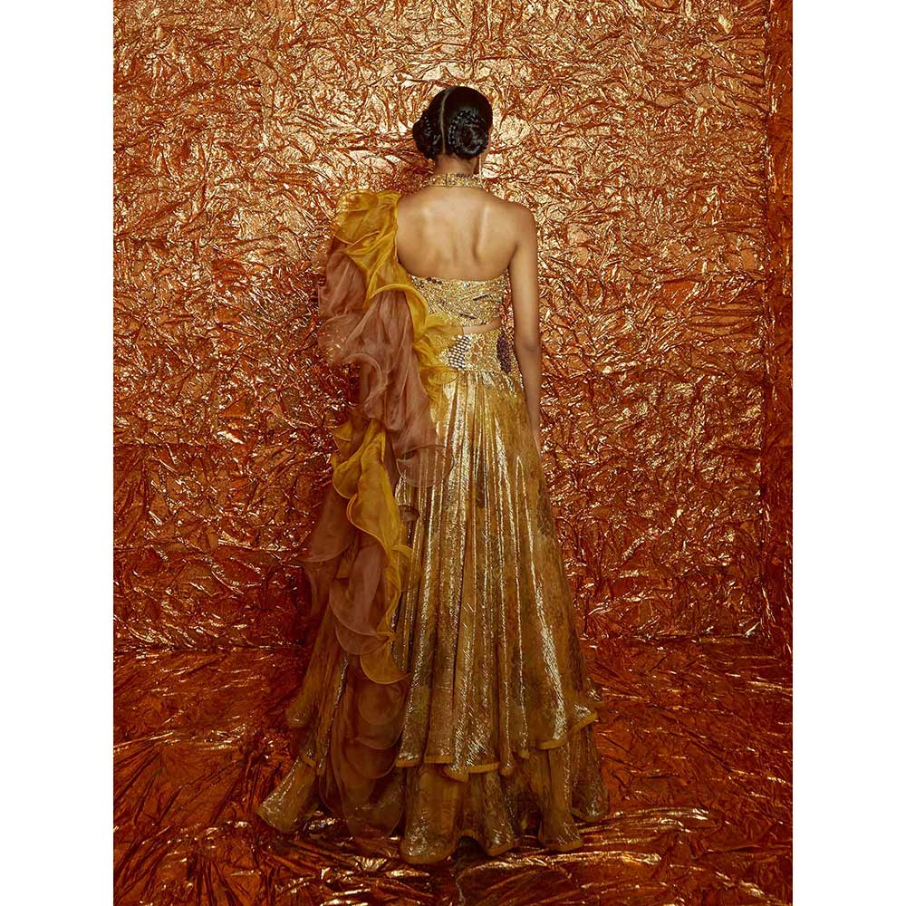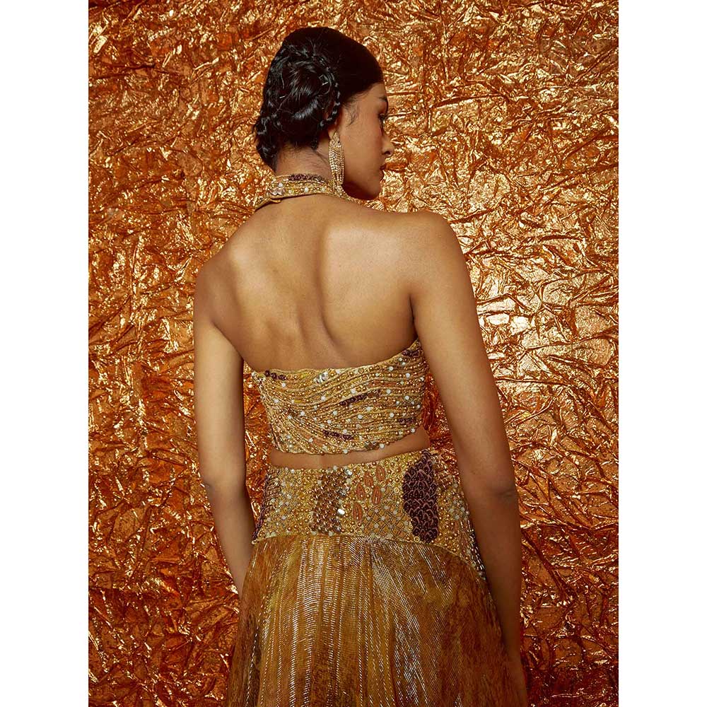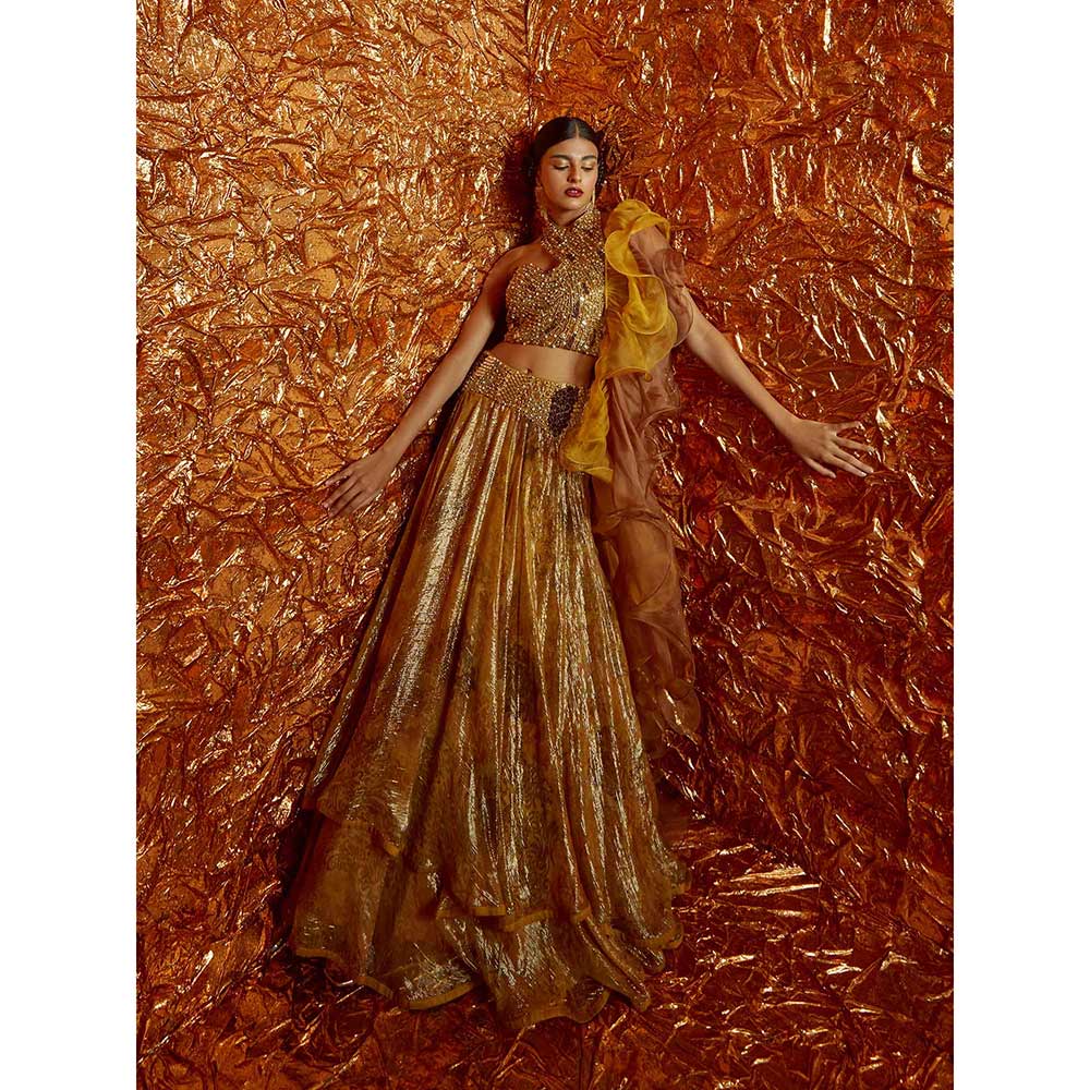 Description : Hand-Embroidered Halter Neck Blouse, Double Flared Mustard Lurex Printed Lehenga with Hand-Embroidered Yoke and Double Layered Organza Dupatta