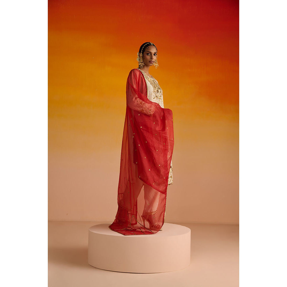 OHH CROW Beige Embroidered Opara Silk Kurta with Pant and Dupatta (Set of 3)