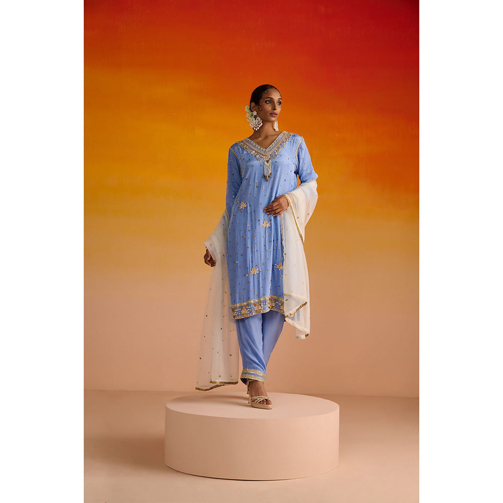 Blue Embroidered Crepe Kurta with Pant and Dupatta (Set of 3)
