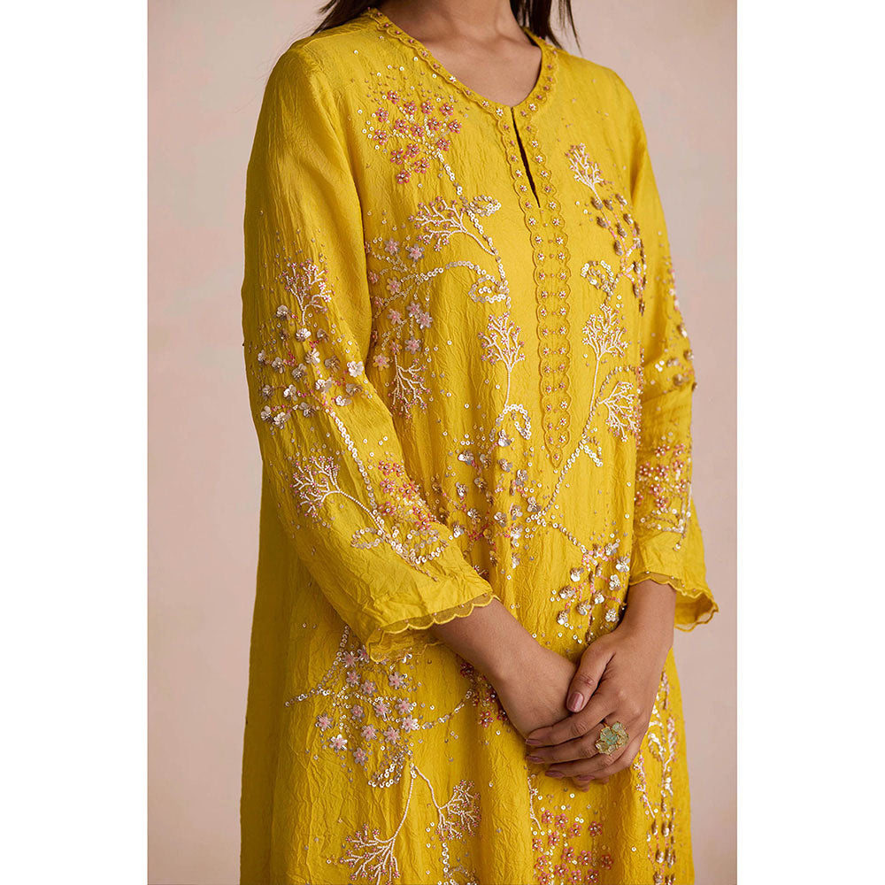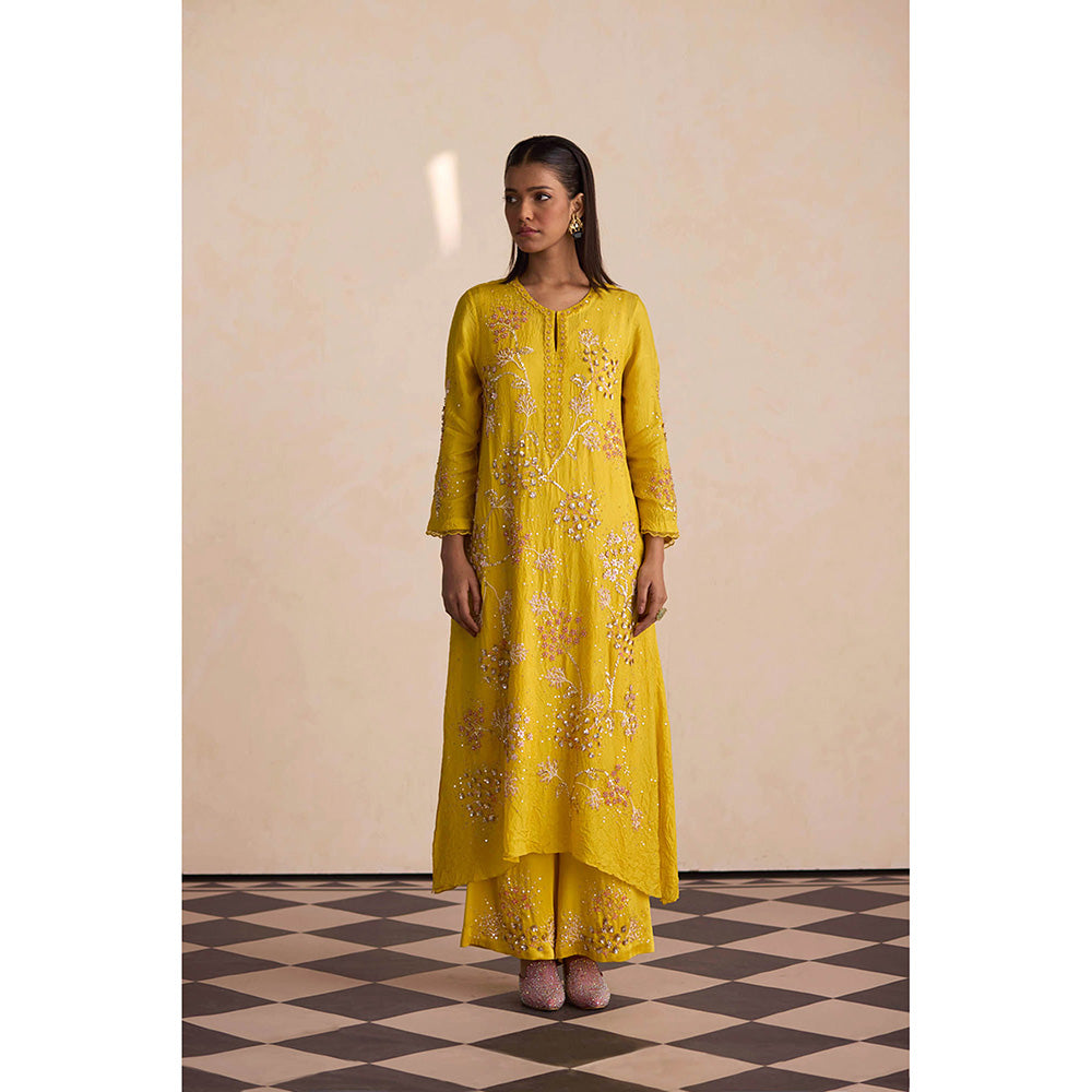 Yellow Embroidered Silk Kurta with Slip and Palazzo (Set of 3)