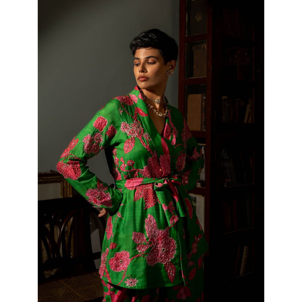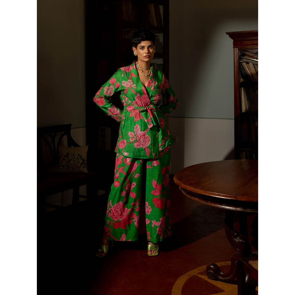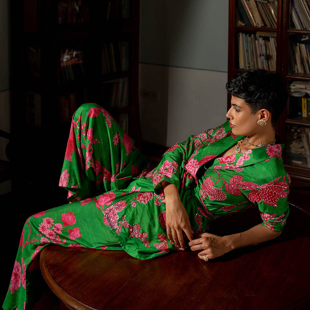 Description : A Tailored Wrap Around Blazzer Set Can Act As A Sleek Evening Wear Option, It'Ll Instantly Add Edge Or Elevate Easy Going Look.Featuring Blooming Print And Remisniscent Of Wildflower Garden, Blazer Is Hand Highlighlight Using Tone To Tone Sequins, Zari, Cutdana And Mirror Embellishments, Teamed With Straight Cut Pants With Side Pockets.