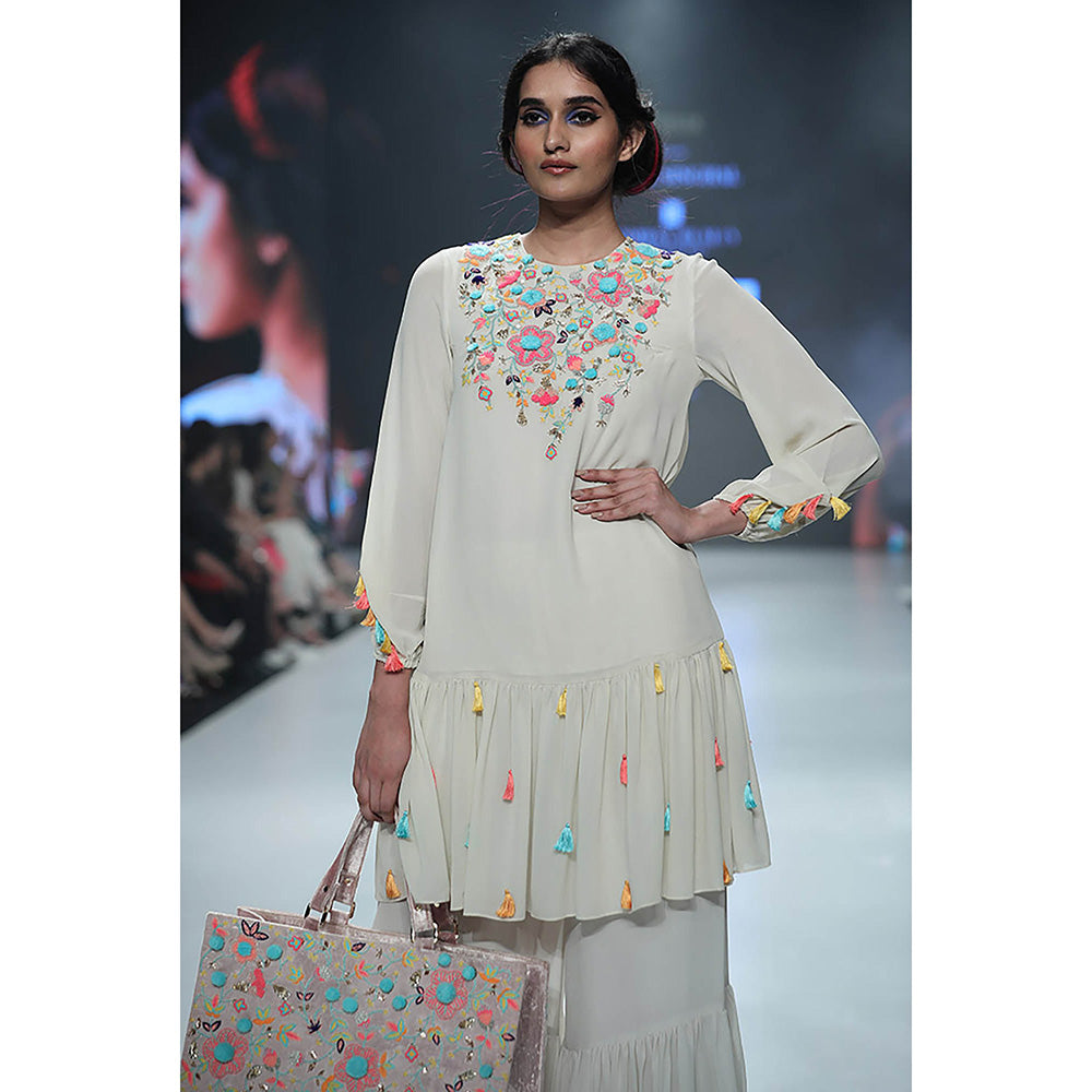 Description : Chalk White Georgette Yoke Embroidered Frill Kurta Worn with Frill Palazzo