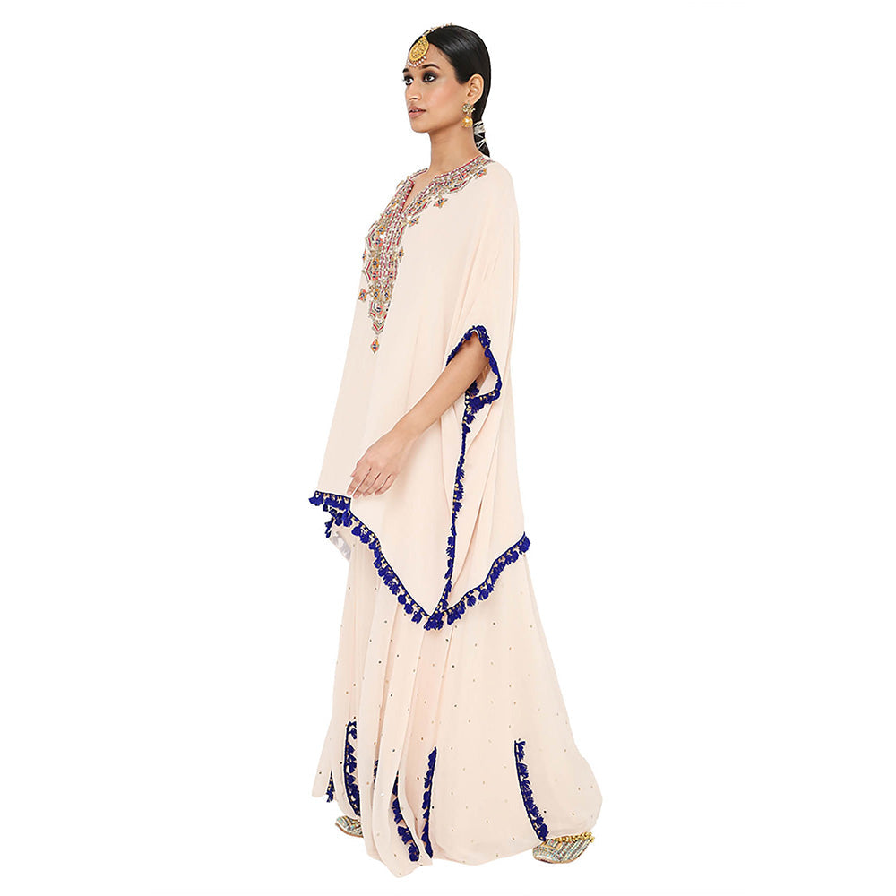 Description : Chalk White Colour Georgette Embroidered Short Kaftan with Dot Mukesh Georgette Sharara with Tassel Details please Note: Top Is Free Size and Bottom Will Be As Per The Standard Size Guide Provided.