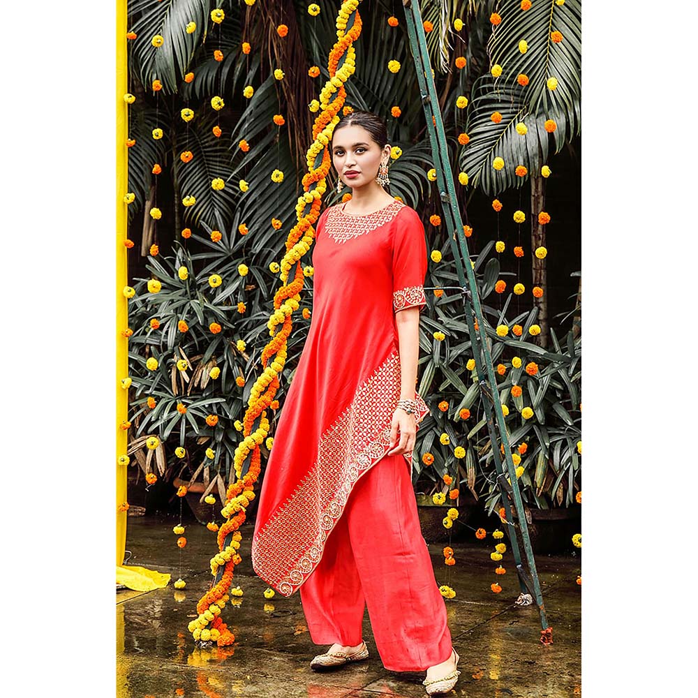 Description : Asymmetrical Kurta With Meticulous Gota,Pearls And Dori Work With Matching Pant