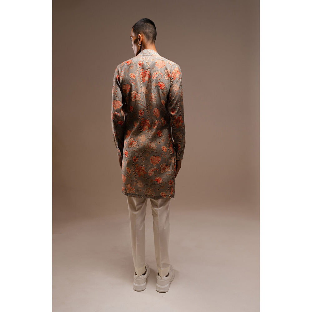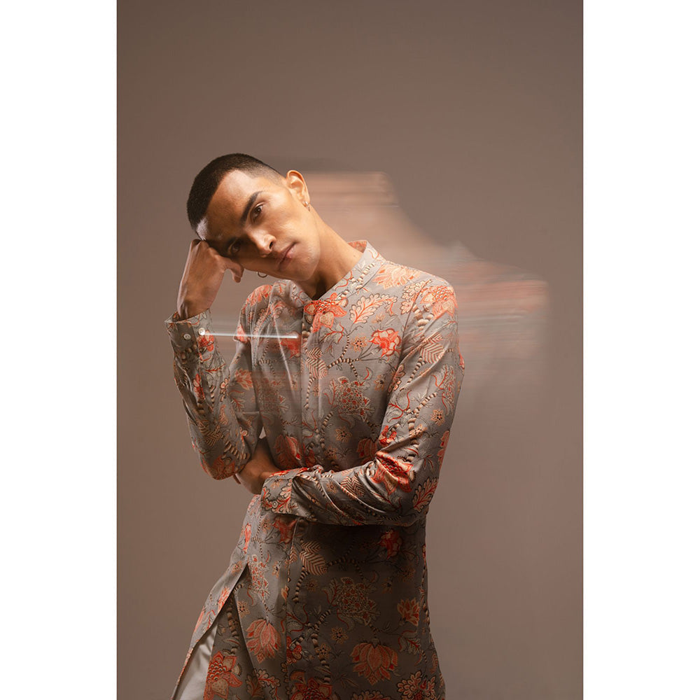 Description : The Grey Hamdard Long Kurta Pyjama Set Includes A Grey Printed Kurta with A Cream Cotton Paramartha's Is A Two-Piece Set. This Kurta Has A Shawl Collar and Concealed Placket Detail. A Crochet Lace Detail Runs From The Collar Down To Create A Slit. The Kurta Is Complete with A Staggered Hemline and Cuffed Sleeves. It Is Constructed with Lightweight Chanderi Fabric, and The All Over Jaal Print Is From Our Archives. The Trouser Style Pyjama Features An Elasticated Back, Zip and Fly Front Closure, and Two Hip Pockets. The Pyjama Is Cut To A Slim Fit and Has Ankle Slits For Ease Of Wear.