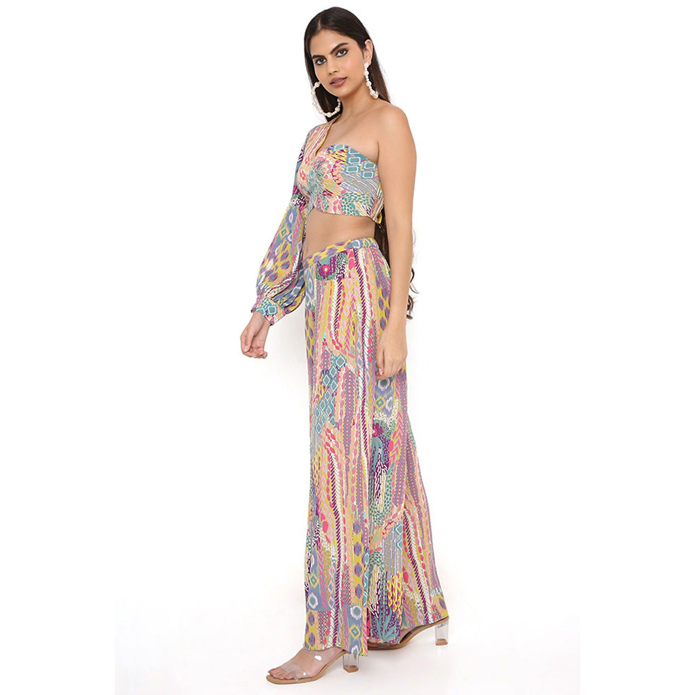 Description : Make an effortless style statement in this trendy multi-colour top from PS Pret by Payal Singhal. Crafted from premium quality crepe in a comfortable fit, this beautiful top is finished with one shoulder and a one shoulder. The top is accompanied by a pair of mid-waist palazzo pants to complete the look.
