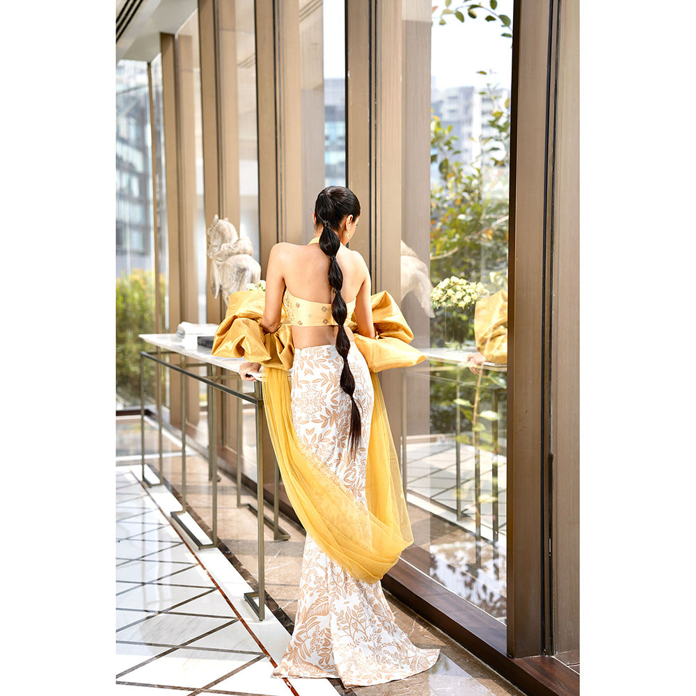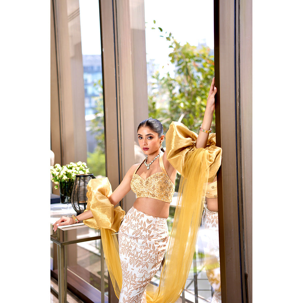 Description : Elevate your ethnic wear wardrobe with Rashika Sharma white blouse, skirt, dupatta set. It features printed pattern with sleeveless, halter neck design with high waist bottom style. It is crafted from finest material. This outfit is perfect for special occasion. Add trendy footwear to complete the look.