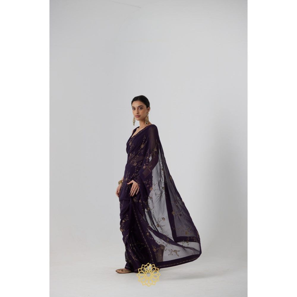Rhua India Navy Blue Yutaka Classical Saree with Stitched Blouse and Petticoat