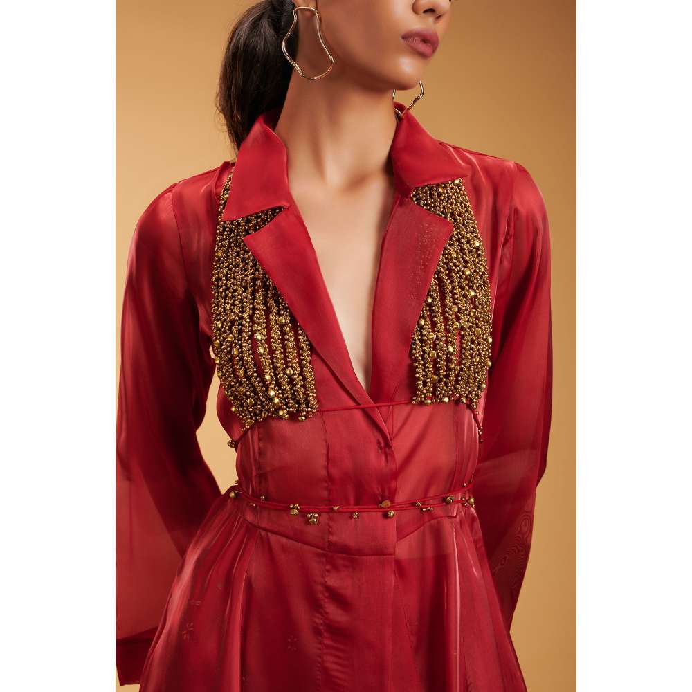 RIRASA Red Beads & Stones Bustier with Pant and Jacket (Set of 3)