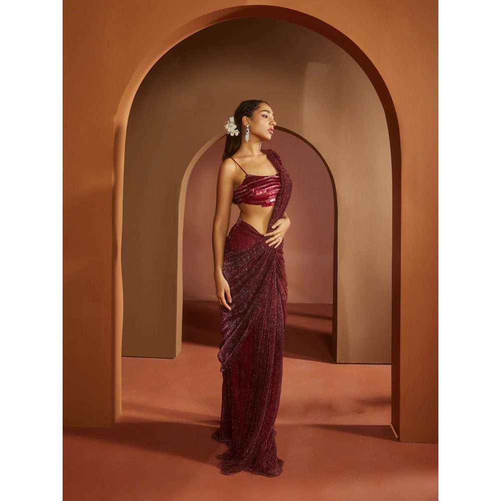 Saanjh by Lea Humaida Maroon Shimmer Pre-Draped Saree with Stitched Blouse