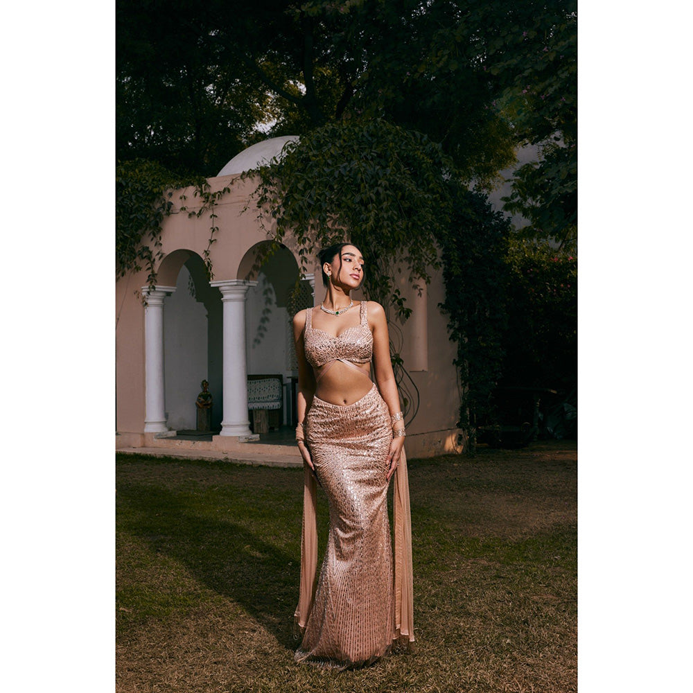 Saanjh by Lea Nazia Rose Gold Embroidered Mermaid Lehenga with Blouse and Dupatta (Set of 3)