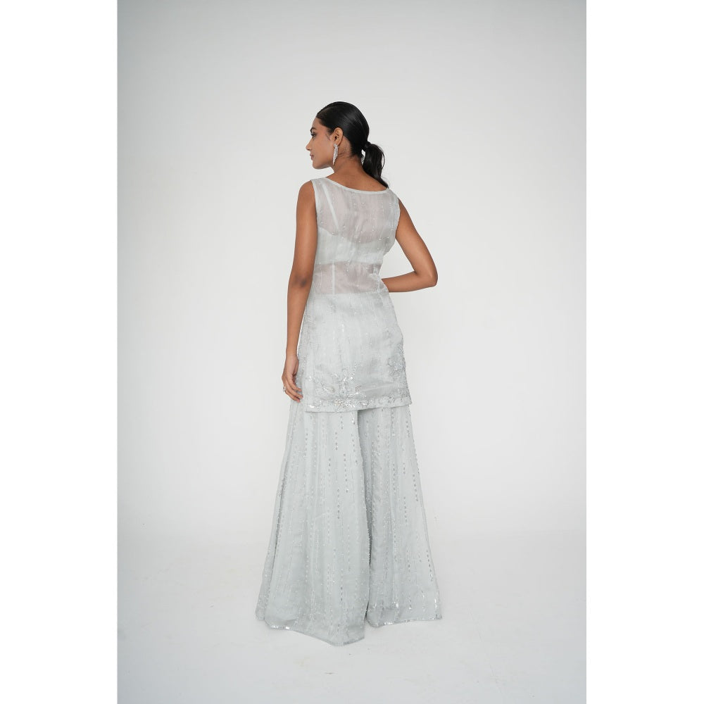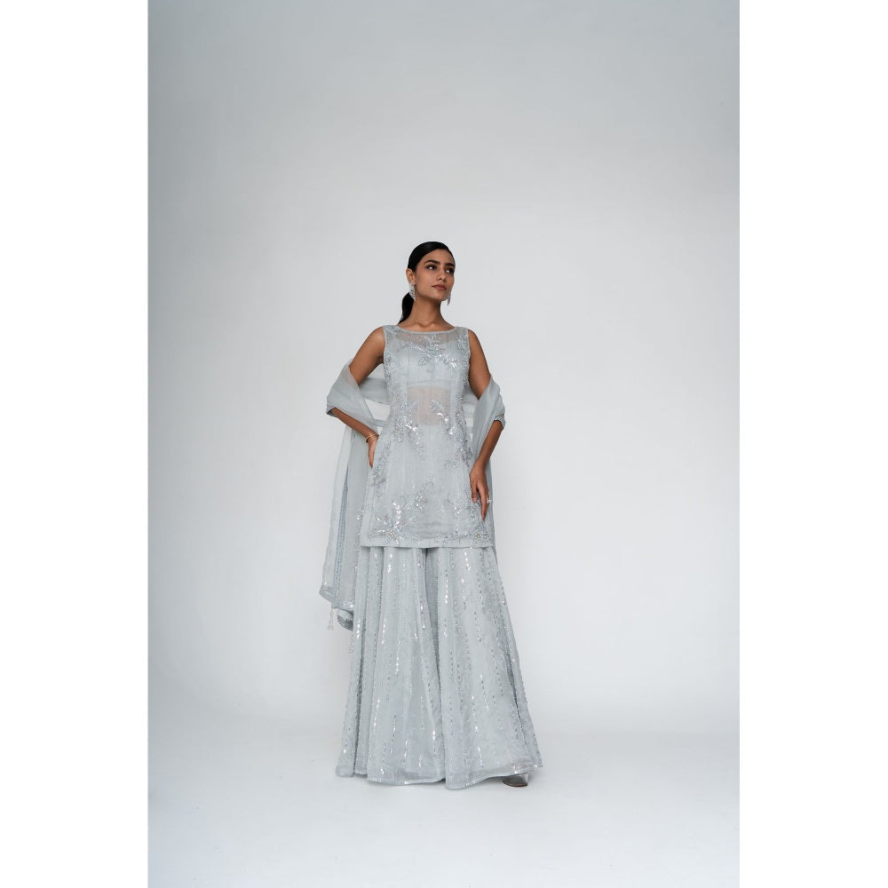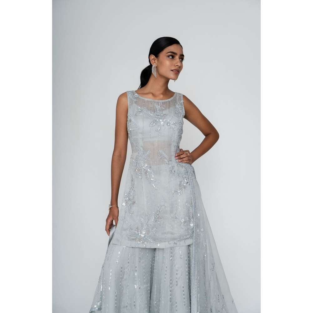 Description : Step in to the world of timeless elegance with our fully embroidered tone to tone organza kurti and sharara set. Tailored to sartorial perfection from premium quality fabric, it assures a soft and soothing touch against the skin. The exquisite silhouette adds to its appeal.