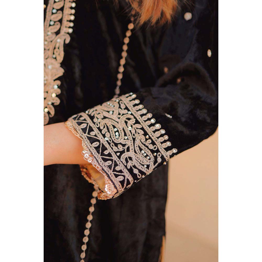 Description : This Short Straight Ensemble Is Crafted From Luxurious Pure Silk Velvet, Paired Perfectly with A Traditional Dogri Salwar. Featuring A Chic Zero-Neck with A Placket and Elegant Three-Quarter Bell Sleeves, It Exudes Modern Sophistication with A Touch Of Classic Style. The Outfit Is Adorned with Exquisite Kiran Dori Embroidery and Shimmering Sitara, Adding A Rich, Decorative Flair. The Entire Piece Is Finished with Delicate Pure Tissue Fabric and Kinnari, Creating A Beautifully Refined Look For Any Special Occasion.