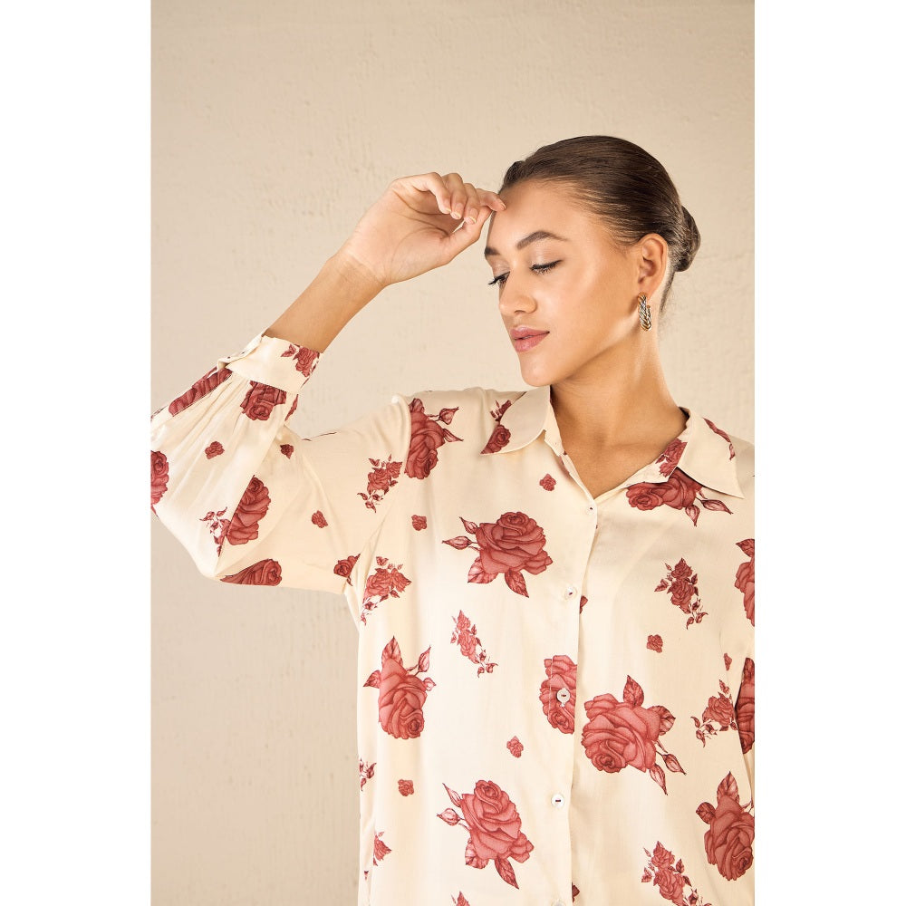 Description : Embrace Ethereal Elegance with This Stunning Ensemble Featuring A Red Rose Printed Bemberg Silk Shirt and Matching Flair Pants.