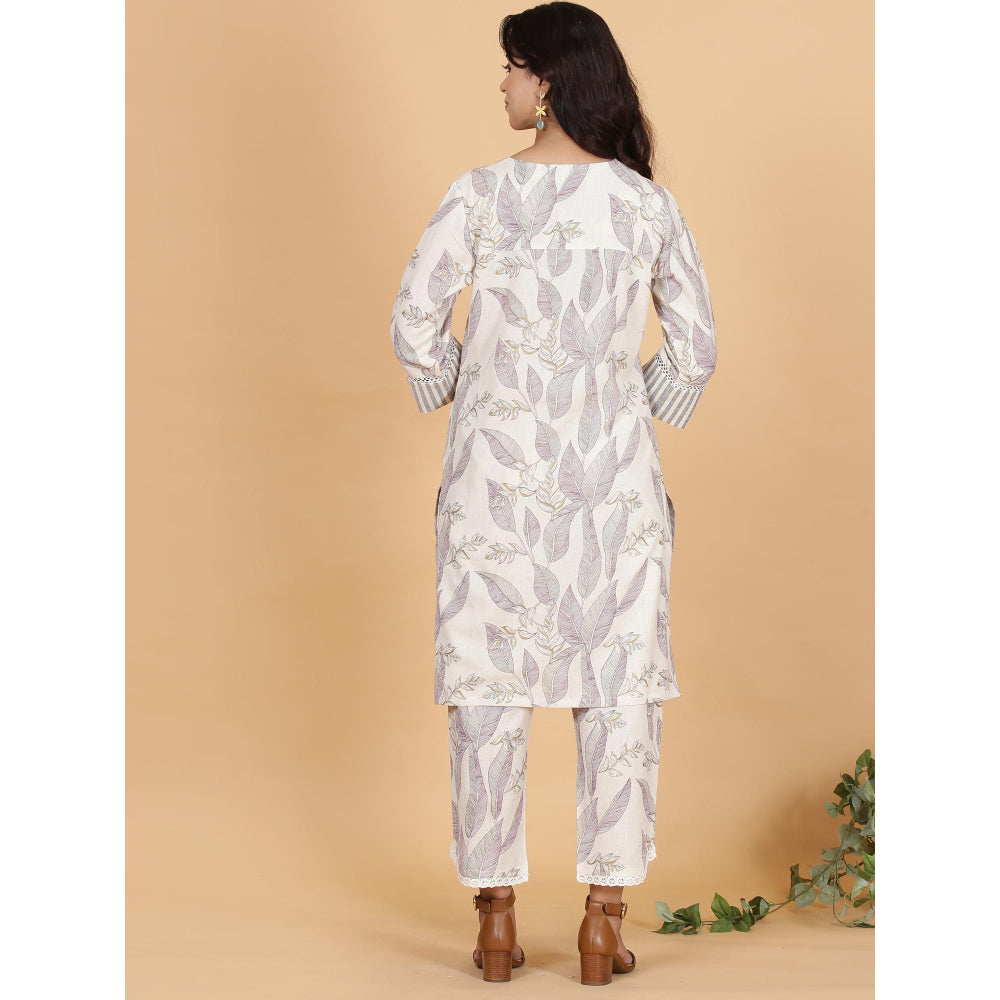 Description : Presenting our cotton flax co-Ord set featuring linear art leaves printed in purple and black with a touch of gold. The V-shaped neckline is adorned with lace and striped fabric, with matching detailing on the sleeves. The Pants feature a curved hem adorned with lace, creating a chic and stylish look.