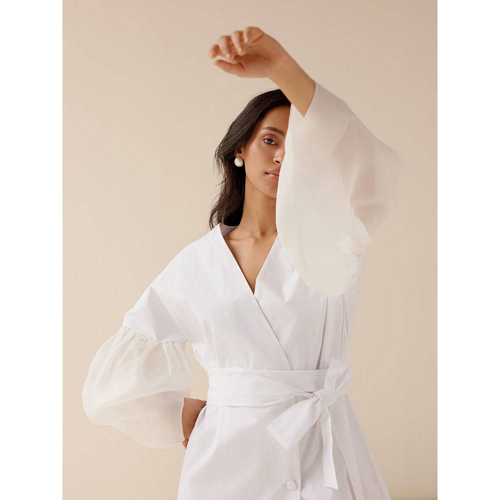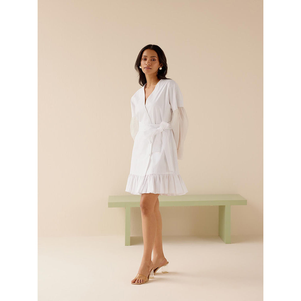 Description : Cotton Overlap A Line Belted Dress with Organza Flouncy Sleeves