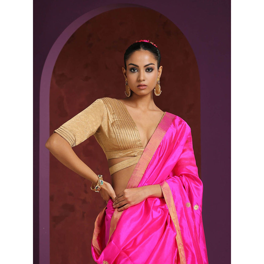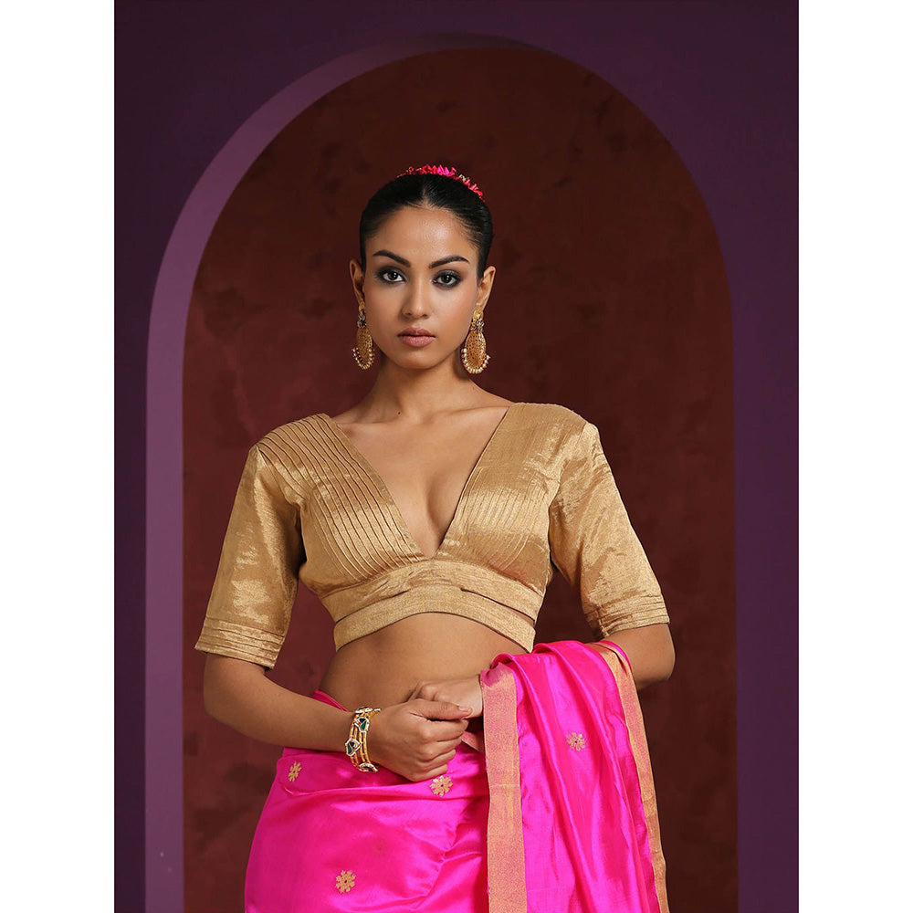 Description : An alluring gold tissue blouse is a must have piece for wardrobe. Beautiful deep V- neck and sleeves are finished with pin tucks and has stylish underbust band for a chich look. Adorn this beautiful blouse along with elegant sarees and lehengas.