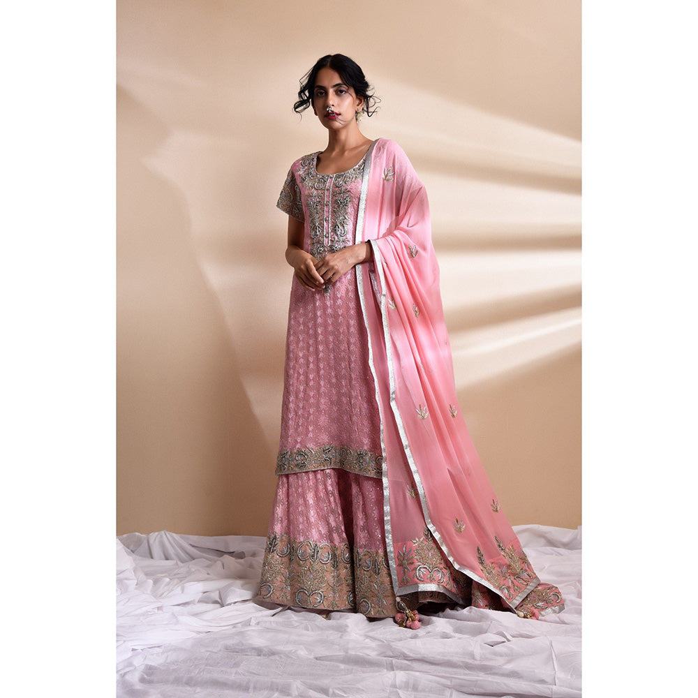 Description : Get in the ethnic vibes with this pink Kurta Set by Kanika Sharma. Made from high quality georgette, it features pull on closure and embroidered pattern along with half sleeves & round neck. Pair it with earrings and bangles to complete your ensemble.