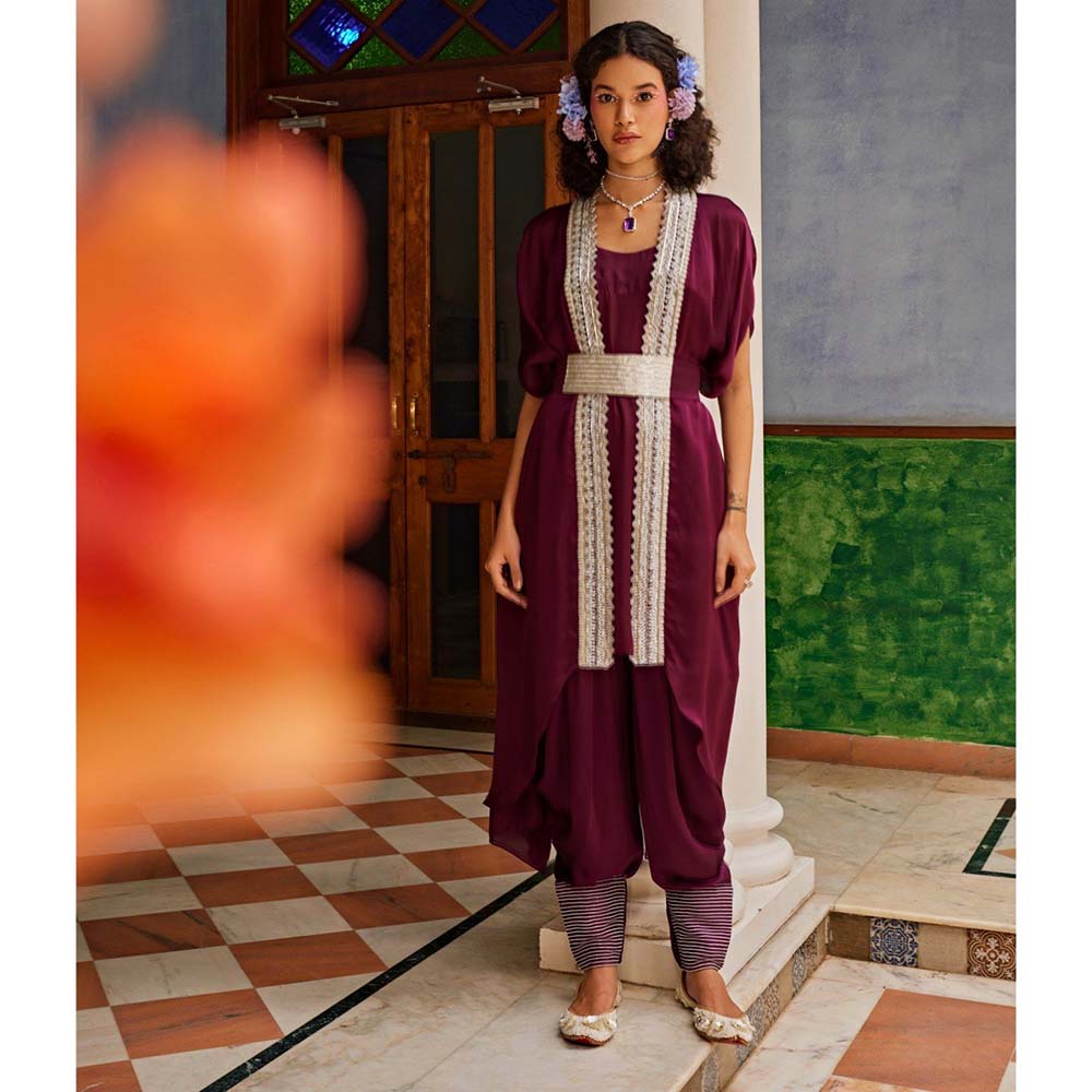 Wine Satin Embellished Jacket With Pant And Belt (Set of 3)