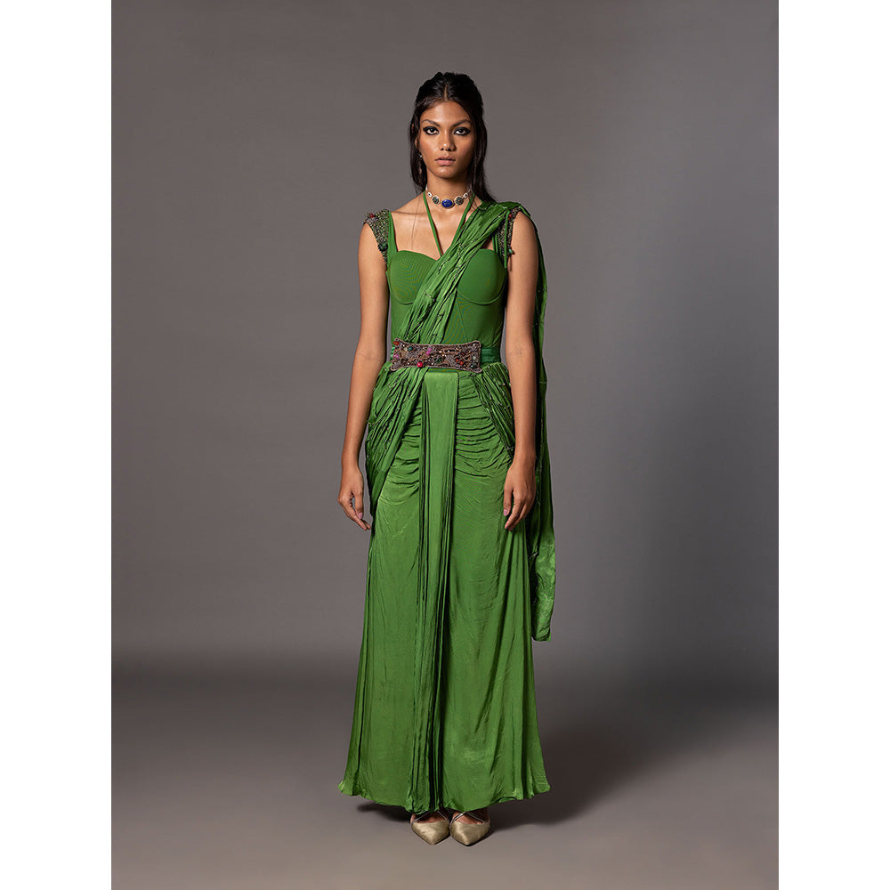 A Humming Way Kalbeliya Emerald Green Corset Saree with Belt