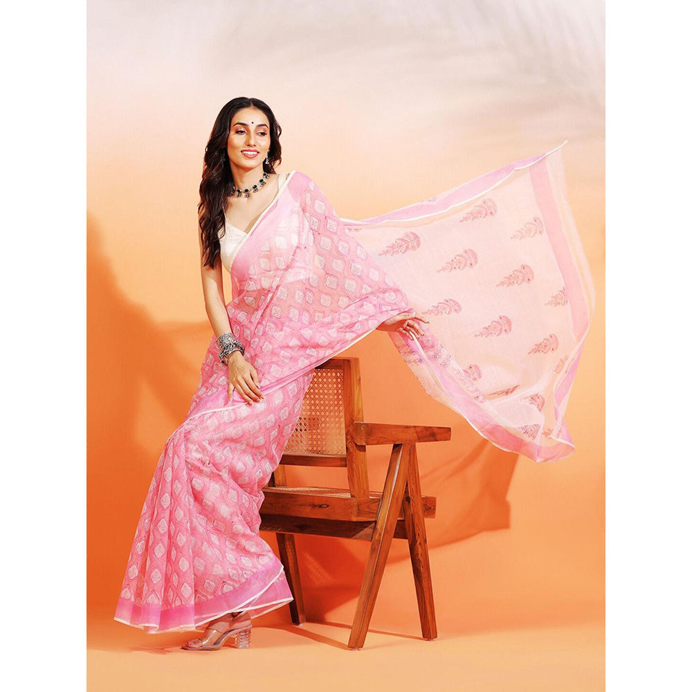 Aditri Handloom Kota Doria Hand Block Print Pink Saree With Blouse Piece