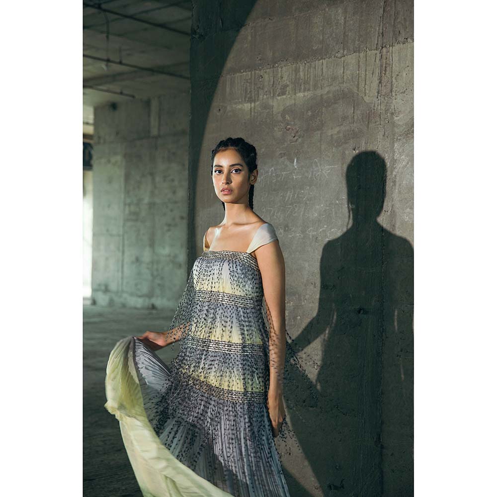 Description : Gathered and Gradient Dyed Chiffon Maxi Dress with Tiered Bands. Bands Crafted In A Handwoven Mesh, Hand Interlaced with Textured Yarns.