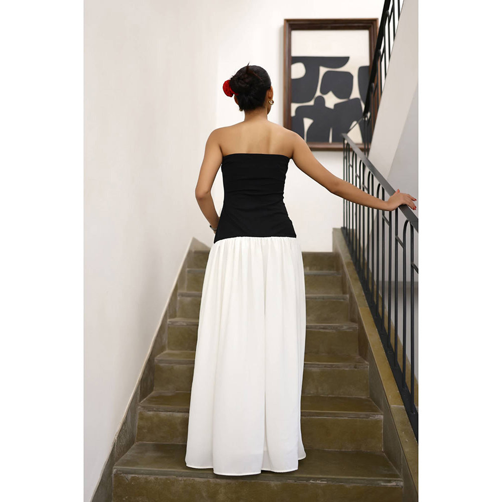 Description : HER STORY If there's one trend we love, it's the drop-waist, maximalizing it with Vine, with a four way stretch bodice, made in dual tone with keeping everything fancy in mind! She will make heads turn, wear her for a special date night, an exquisite social event, a romantic getaway or a viewing at the gallery! She will always do you good. FINER DETAILS Bandeau neckline Drop waist bodices light gathers on the waist One side pocket left side zip closure Length from shoulder to hem: 50 inches Our model is 5'6" and wears a size XS & nbsp; Fabric and wash care: Lycra and moss crepe Dry Clean or gentle hand wash only.