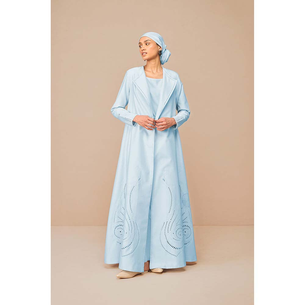 Description : Raysa Jacket Set Meet Raysa, The Jacket Set That Glimmers Under The Summer Sun. Delicate Chanderi (Cotton Silk) Serves As A Canvas For Intricate Cut-Work, Resham And Dori Embroidery, Taking The Form Of Peacocks And Blooming Flowers. Accompanied By An Inner Dress With A Soft Square Neckline In The Same Soothing Ice Blue And A Faux Leather Belt. The Draped Lapels Lend Raysa An Understated Elegance That Makes Her Perfect For Family Gatherings With The Grass Under Your Feet And A Clear Sky Above.